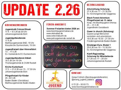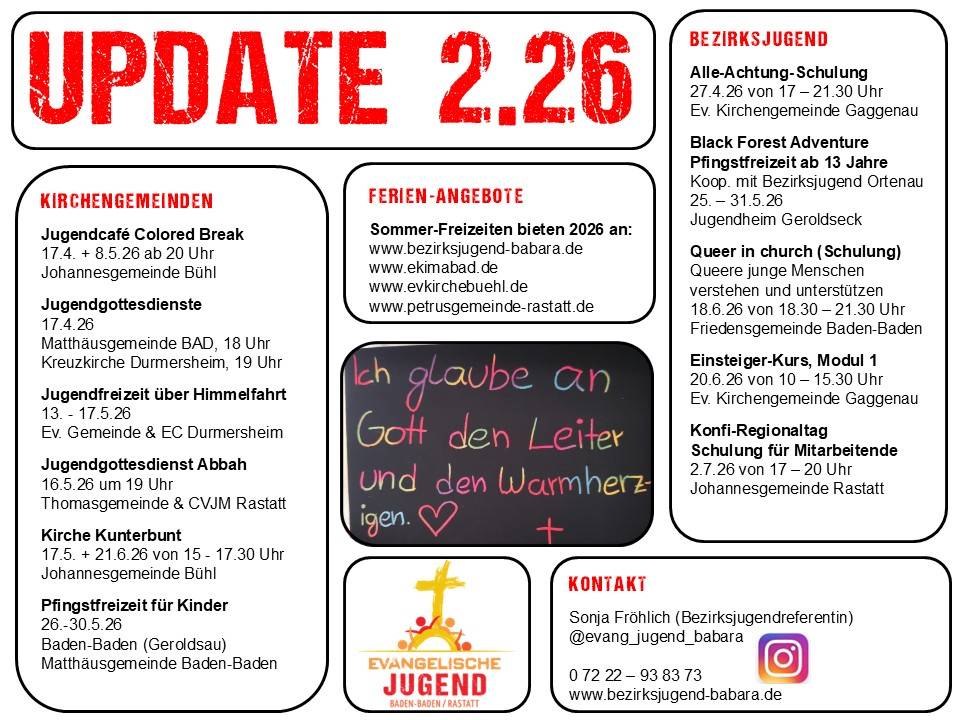 Das neue Termin-Update der Bezirksjugend ist da. Mit verschiedenen Veranstaltungen für Kinder und Jugendliche in unserem Kirchenbezirk Baden-Baden und Rastatt.